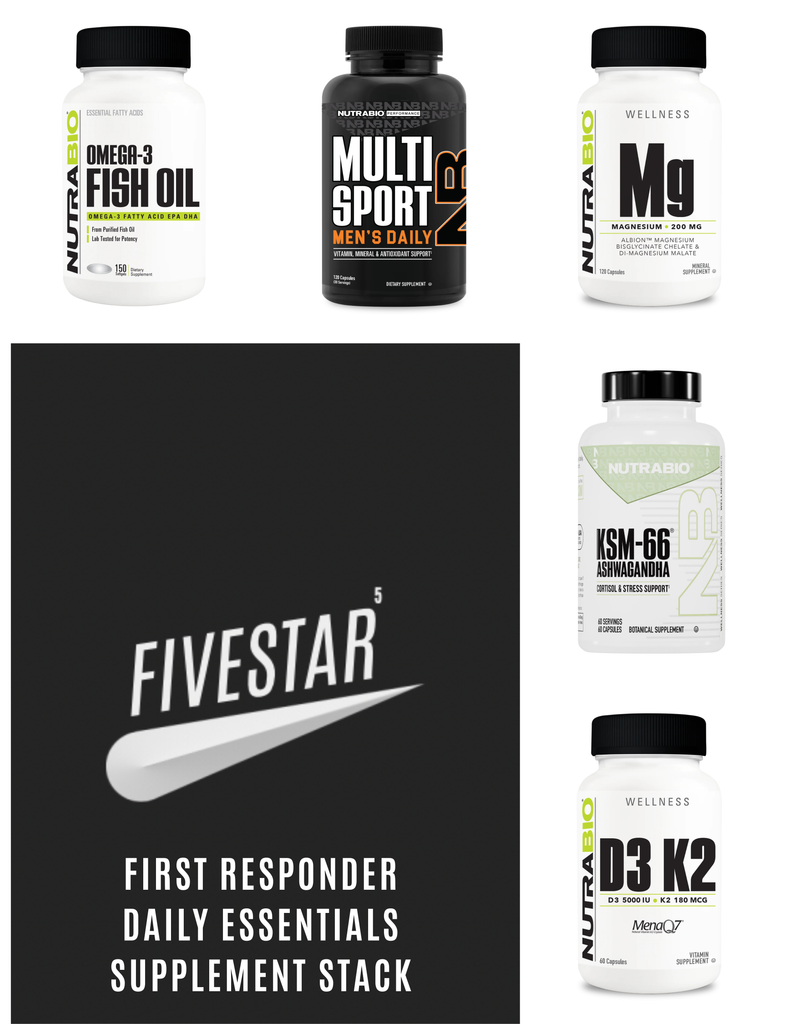 First Responder Daily Essentials Stack – Built for those trying to maximize their overall physical and mental health. This premium blend of Vitamin D, KSM-66 Ashwagandha, Magnesium, Fish Oil, and a high-quality Multivitamin is designed to meet the unique demands of those on the front lines.